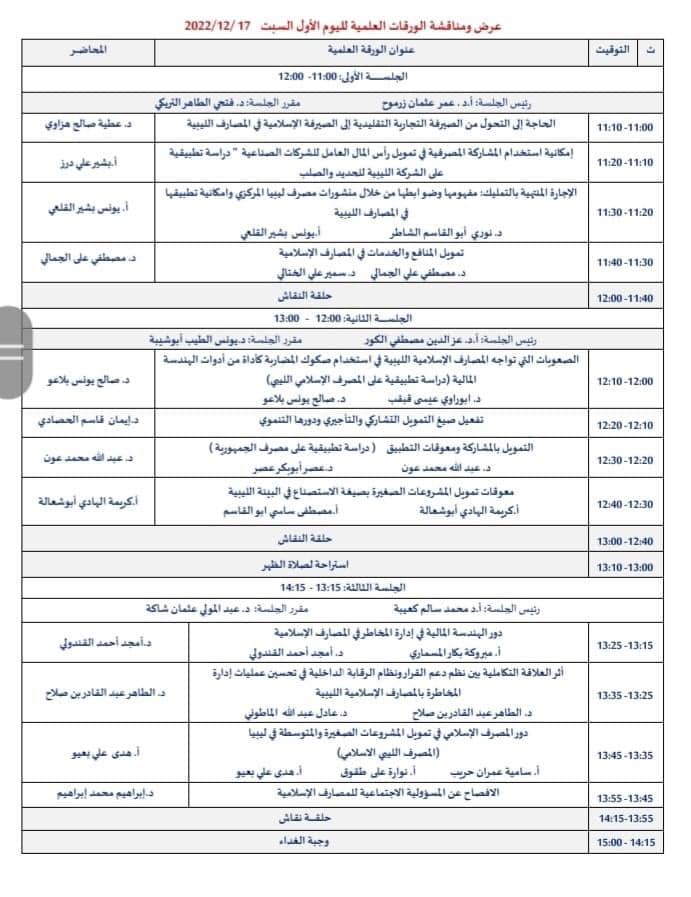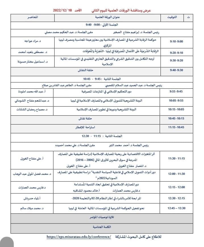 تحت عنوان "المصارف الإسلامية .. بين الواقع والمأمول، وبتنظيم من كلية الاقتصاد والعلوم السياسية - جامعة مصراتة يومي السبت والأحد 17 - 18 2022/12، بصالة فندق التاج.
